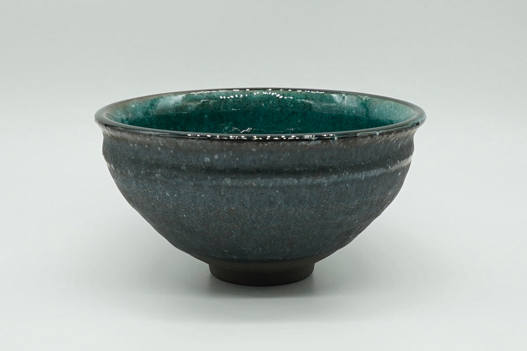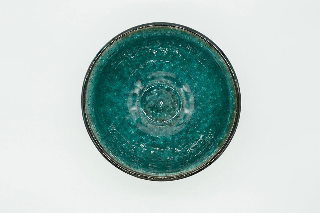 Discover the perfect balance of earth and water with our captivating Suisyo matcha bowl. its exterior, reminiscent of dark grey stone, exudes an air of ancient wisdom and grounding. The moment you gaze inside, you're greeted by a serene turquoise blue, like a tranquil pond reflecting the clear sky.